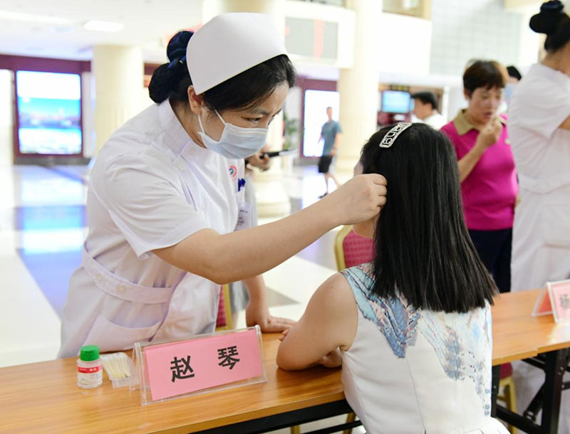 中医护理技术体验区开展棍针、耳穴压豆、铜砭刮痧等受到追捧,耳穴压豆治疗区更是排起了长队。中医专科护士一边用探针探究患者穴位反应,一边针对性介绍耳穴压豆改善睡眠、颈椎腰腿痛、耳鸣耳聋、骨质疏松、降低高血压等功效、机理及中医保健养生知识,让群众亲身感受祖国传统中医药文化的独特魅力。
